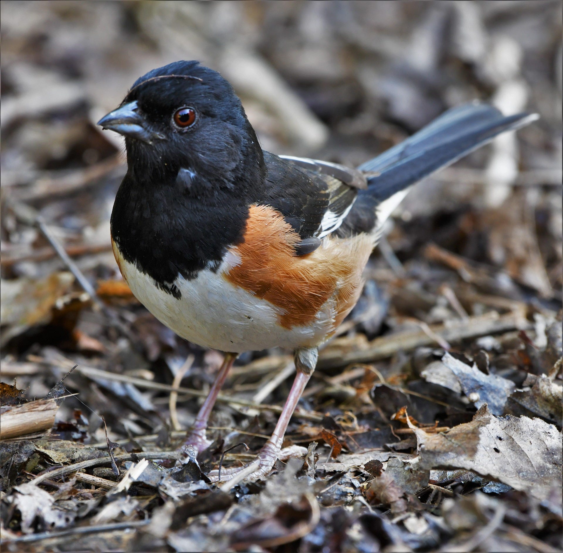 An Eastern Towhee visited my feeder recently. In 32 years of living where I do, I’ve never seen one. They’re ground feeders mostly, scratching backwards at leaf litter like a chicken, and you’re more likely to hear one than see one, a catchy drink-your-teeeea from somewhere in the underbrush. That day, the ground was covered in snow again after a short thaw between storms, so up it came.